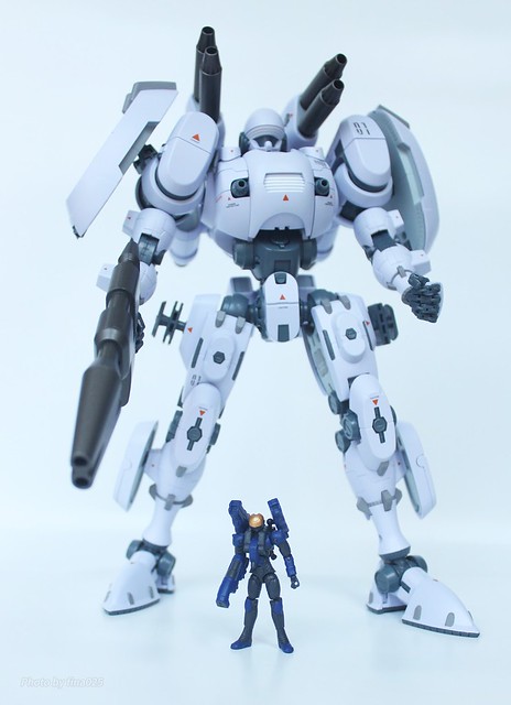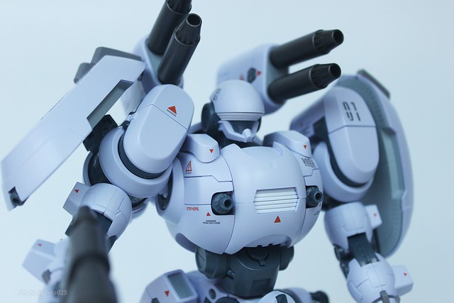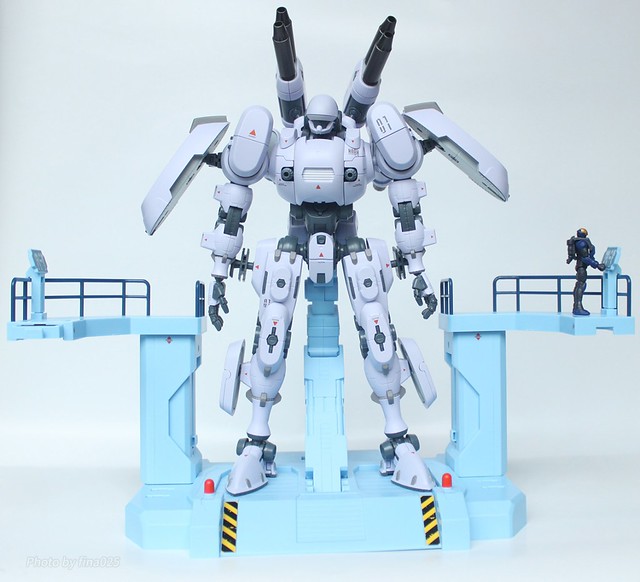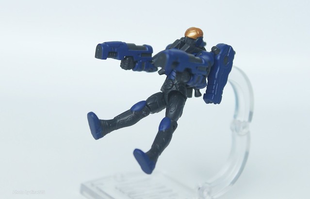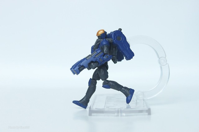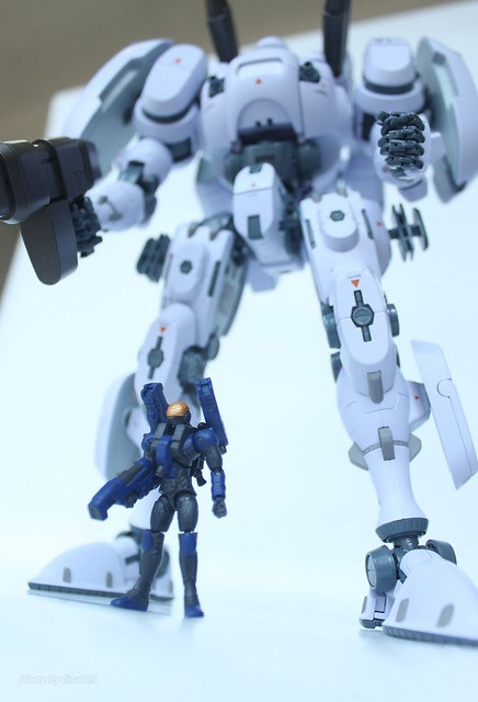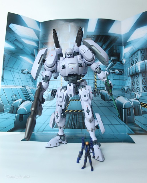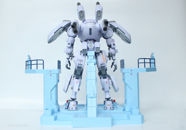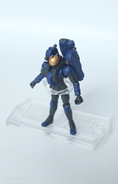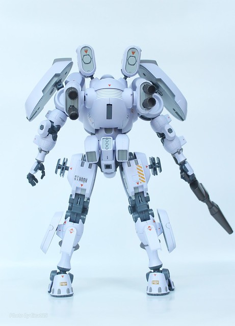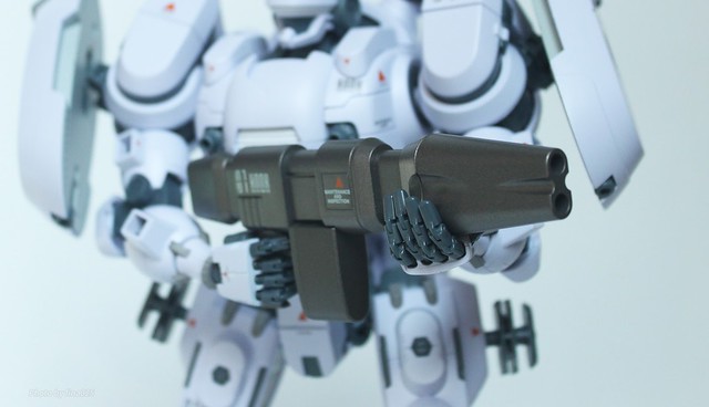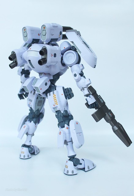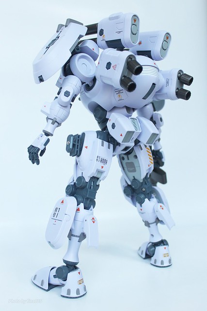 整體可動都不錯,附掛裝備和插孔我是照官方造型,不過其實可以自由地設置。頭部幾乎不可動。手臂接身體的球關節比較鬆,容易垂下來,如果手上沒拿槍的話情況會好些(這種問題貌似有辦法可以解決,想想總比有些玩具裝太緊反而會裂要好。)腳踝部分如其他開箱影片所說,會一邊玩一邊傾斜,不過這麼大的機體也是正常。