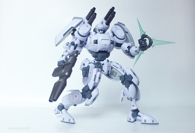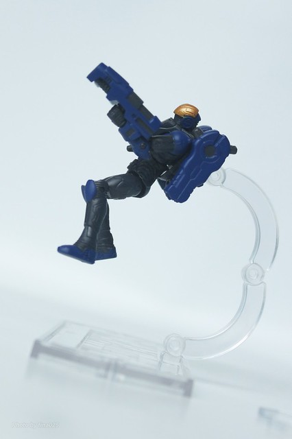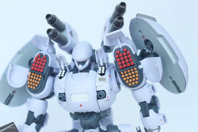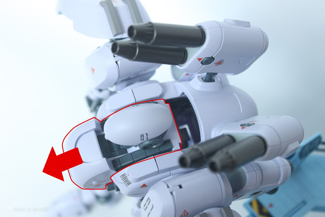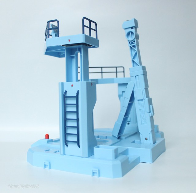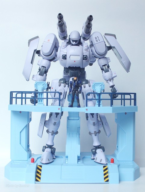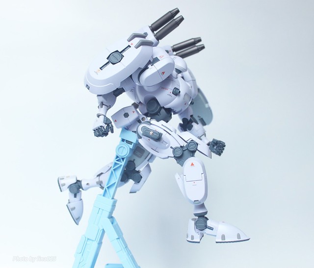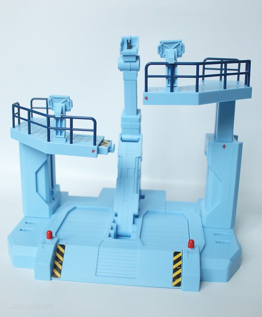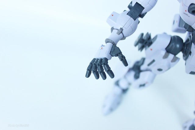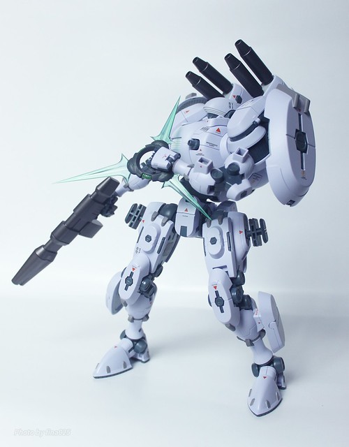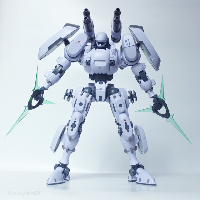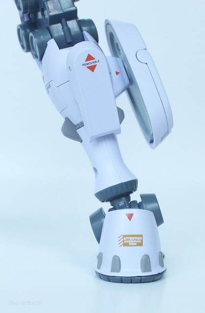 整體可動都不錯,附掛裝備和插孔我是照官方造型,不過其實可以自由地設置。頭部幾乎不可動。手臂接身體的球關節比較鬆,容易垂下來,如果手上沒拿槍的話情況會好些(這種問題貌似有辦法可以解決,想想總比有些玩具裝太緊反而會裂要好。)腳踝部分如其他開箱影片所說,會一邊玩一邊傾斜,不過這麼大的機體也是正常。