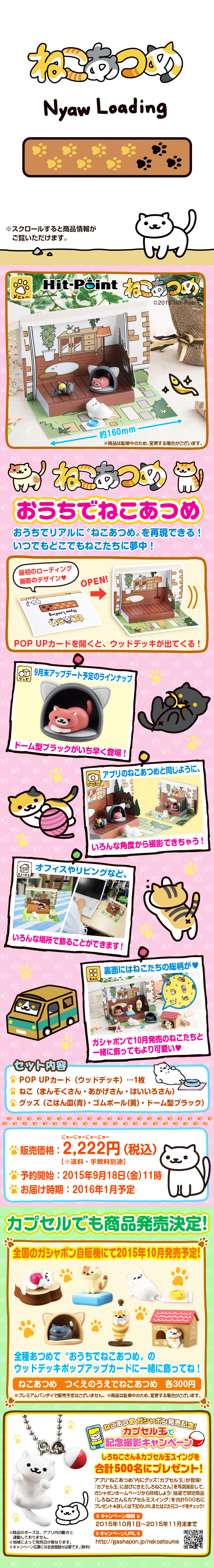 這一款名為「人家在收集貓咪」(暫譯,おうちでねこあつめ) 是由軟體公司Hit-Point 與BANDAI 所合作推出。組合內容將包含一個在遊戲中出現的場景所製作的卡片,並且收錄了大人氣的三款貓咪「まんぞくさん」、「あかげさん」與「はいいろさん」,以及能夠呼喚更多新貓咪登場的道具「猫缶」「ドーム型クッション」「ゴムボール」。