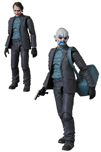 日廠MEDICOM TOY公司的『MAFEX』可動系列之前已經推出過電影蝙蝠俠當中的The Joker 小丑,這次再推出《黑暗騎士》電影一開始的時候手拿著小丑面具的搶劫銀行版本(BANK ROBBER Ver.),身穿著素色襯衫和西裝揹著推滿手榴彈等等武器大背包的模樣再現,商品附有多款可以替換的手首、手槍等等配件,喜歡電影《蝙蝠俠》系列的玩具人千萬別錯過了歐!