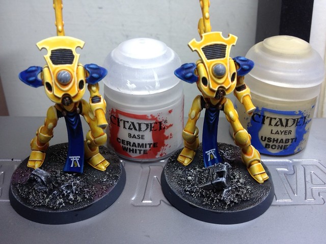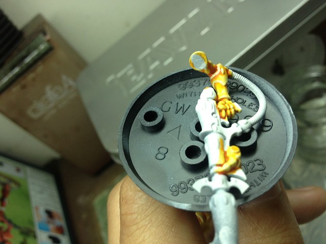 說了這麼多設定還是來做模型吧,首先最初的底色是白色,是使用GW出品的Corax White噴罐,其實跟TAMIYA比起來容量除以價格是差不多的,優點是噴出粒子小,適合用在微縮模型上(畢竟是幫自己產品出)。然後再用Yriel Yellow來上底色,就可以完成黃底效果了。
