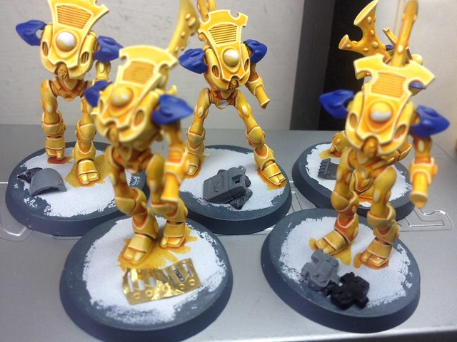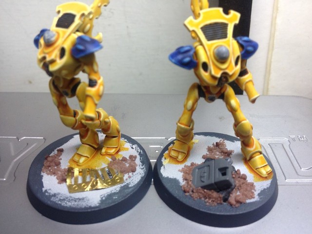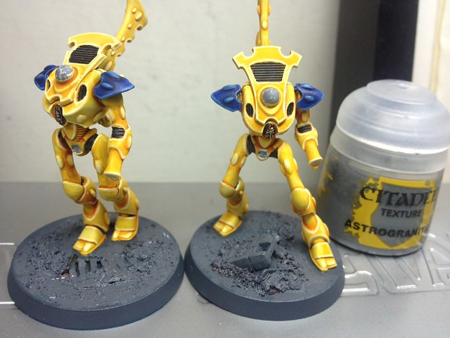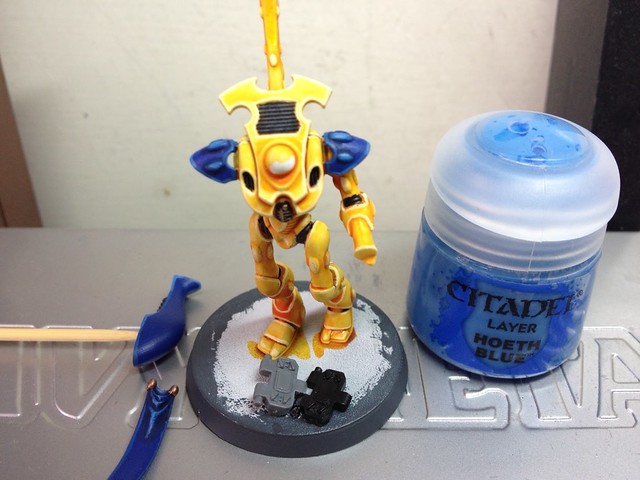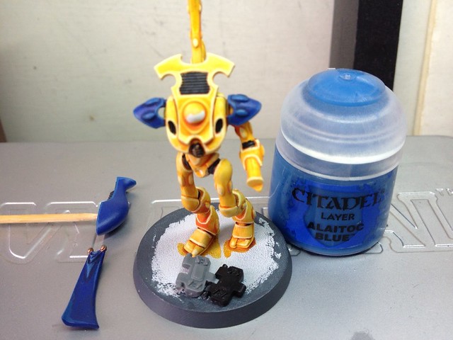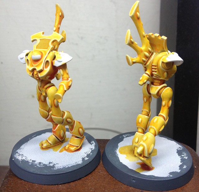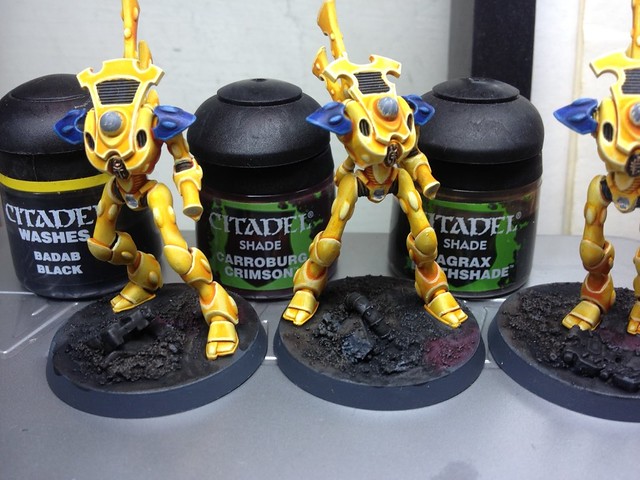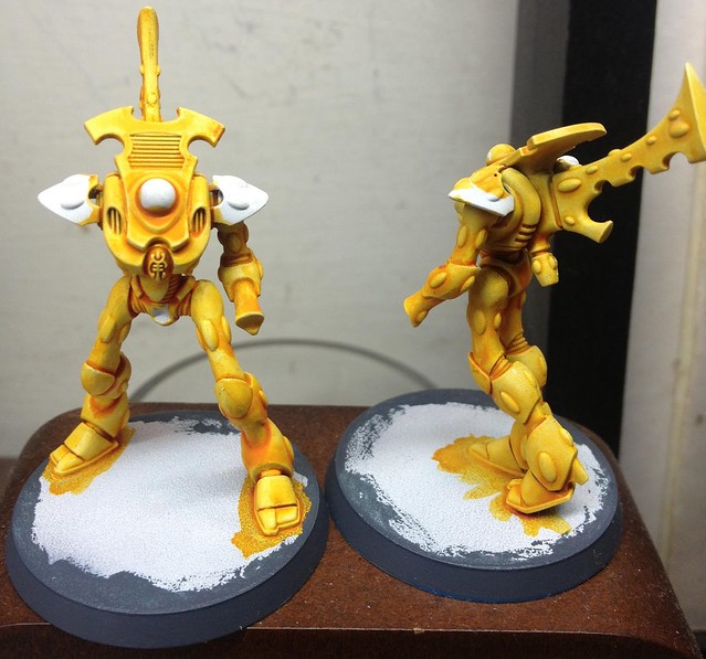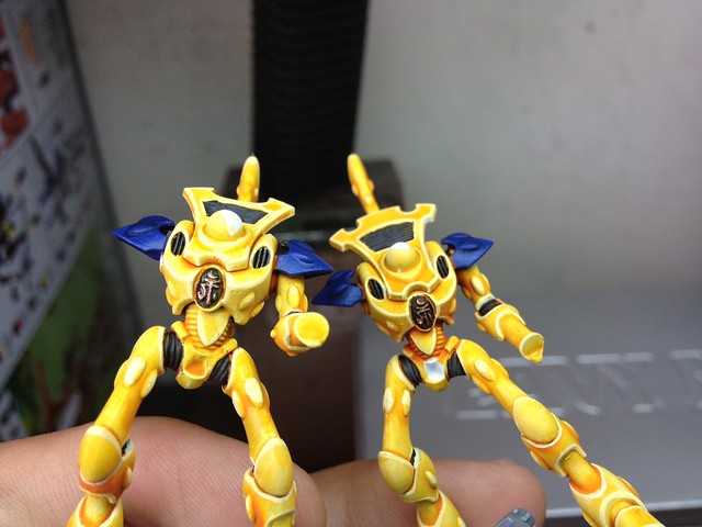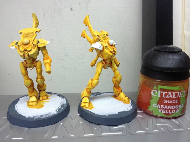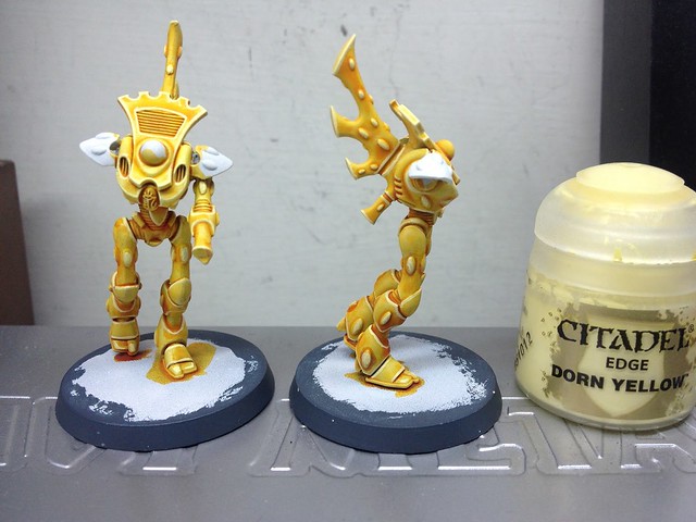 第二步是使用Lamenters Yellow,Citadel出版的釉彩漆,照片中的是舊版顏料,使用新版的黃色是沒有色差的。再使用的時候我們不用大刷子,而是用小筆塗抹在關節或者凹槽處,這樣陰影效果就完成了。