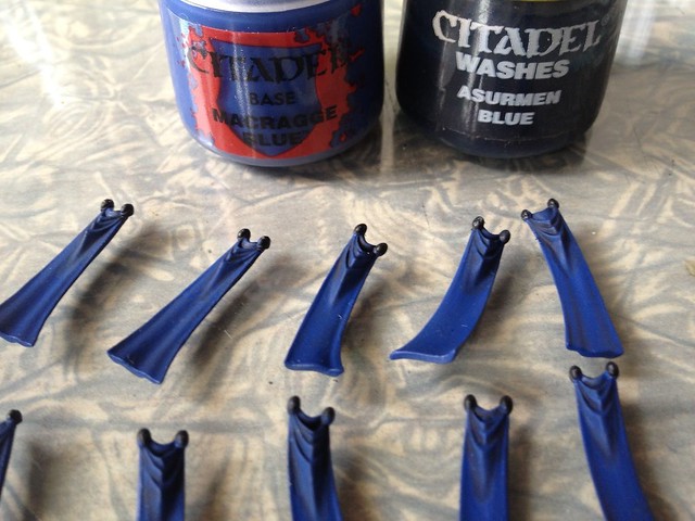 藍色的部分比較少,主要是跨下的布料肩膀以及頭。布料的話可以用Imperial Primer,是黑色的底漆不過是筆塗的,跟黑色不同的是塗完之後表面會有更好的抓色效果,因為這幾條布料的分量很少所以才沒有用噴罐,否則都還強烈建議用噴罐比較適合。用Macragge Blue作為底色,就簡單地塗上去即可。