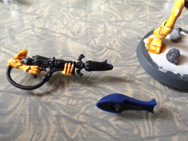 毫無疑問地把武器塗成黑色,小心不要塗到已經做好的黃色部分即可,如果不小心塗到了要補回來也是可以,只是黑色要轉回黃色是段很漫長的旅途,所以還是製作的時候小心為上。