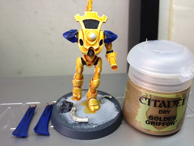 再來是用乾刷顏料製作金色高光,我們用Golden Griffon來乾刷。不要拿太好的筆,最好是質地較硬(豬鬃,水牛)的筆,沾一些起來之後再把粉末散開。乾刷系列本生就已經是乾粉所以不需要花太多時間刷乾顏料就可以直接使用。