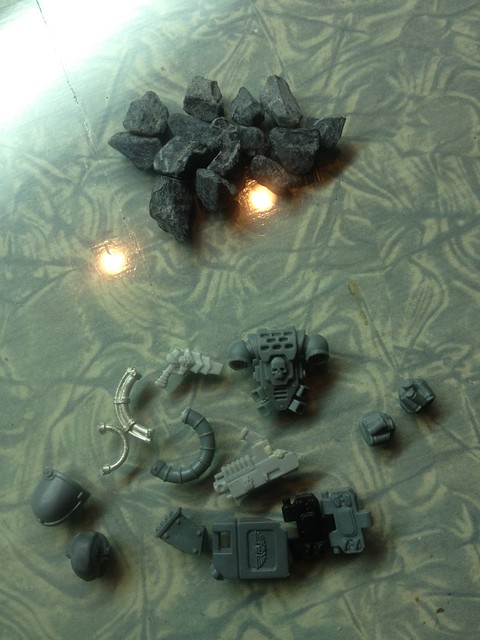 大部分玩家只要模型多到一定程度就會有像這種各式各樣大小多餘的零件,我們俗稱屍塊。再底板上放一些零件作點綴,如果沒有也可以用花圃的小石頭代替。