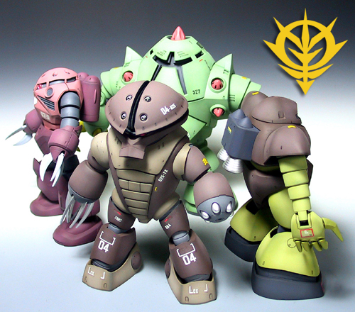 ▲ 吉翁軍的水陸兩用MS皆配備內藏式Mega粒子砲,初期的葛克(右)和索克(後)沒有集束裝置,Mega粒子會以無秩序的方式向四方擴散,而亞凱(中)和茲葛克(左)則採用可集束和加速的「砲管」,發射方式更接近光束槍。