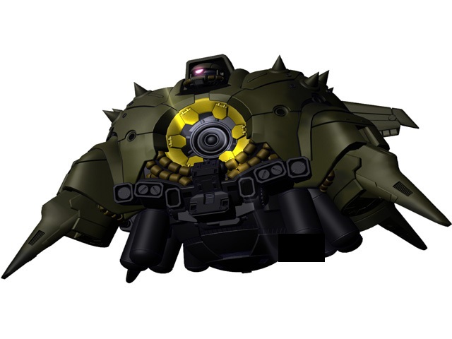 ▲ 《機動戰士鋼彈08小隊》中登場的阿普薩拉斯II,據點攻擊用試作MA,搭載了米諾夫斯基懸浮技術,能夠在大氣圈內飛行,並擁有大口徑Mega粒子砲。不過,加裝了薩克頭並沒有比較厲害。