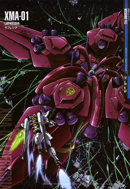 ▲ 《鋼彈F91》最終大魔王XMA-01拉弗蕾西亞,五個葉片底下共有125支「觸手」,同時具有格鬥與光束武器的功能,利用鐵甲面頭盔底下的新型精神感應系統,以大量光纖連接到神經接收器,可將巨大的機體當成身體一般靈活操作。
