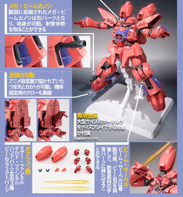 ▲ ROBOT魂AMX-015蓋馬克,除了全身上下塞滿火力強大的Mega粒子砲之外,背上還裝了子母型精神感應砲,兩枚巨大的媽媽感應砲之中,各藏了14座小朋友感應砲,結合了續航力與機動性兩項優點。