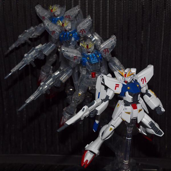 ▲ 鋼彈F-91在最大功率下,裝甲材質會發生剥離現象,形成具有質量的分身殘影稱之為「MEPE」(金屬剝離效果Metal Peel-off effect),讓敵方無法捕捉其真身。日本玩家為了重現質量殘影效果,居然多買了三架透明限定版,真是很有愛啊。