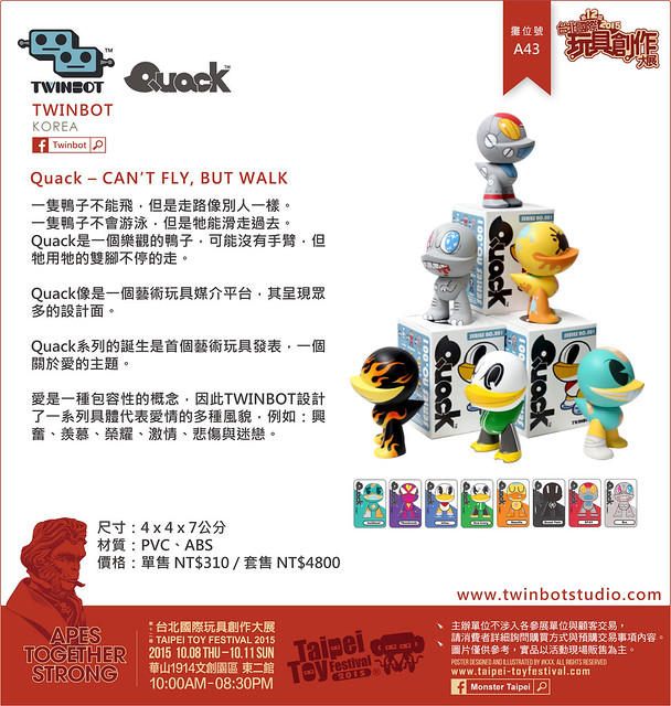 一隻鴨子不能飛,但是走路像別人一樣。 一隻鴨子不會游泳,但是牠能滑走過去。 Quack 是一個樂觀的鴨子,可能沒有手臂,但牠用牠的雙腳不停的走。 Quack 像是一個藝術玩具媒介平台,其呈現眾多的設計面。 Quack 系列的誕生是首個藝術玩具發表,一個關於愛的主題。 愛是一種包容性的概念,因此 TWINBOT 設計了一系列具體代表愛情的多種風貌,例如:興奮、羨慕、榮耀、激情、悲傷與迷戀。