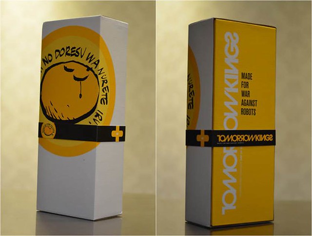 ▲ 外包,整個色調以黃白色調為主,也進一步突出了這款TK的主打色調。(這裡插一句,色系是3A非常擅長的領域。)另外,正面的LOGO也是這款TKT恤上的LOGO,背面為產品的TK的全稱英文(tomorrowking)以及關於TK簡單的介紹(made for war against robots)