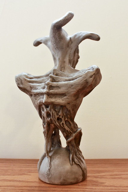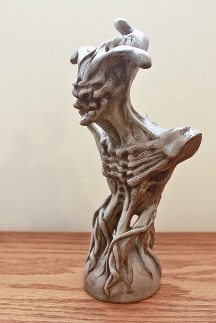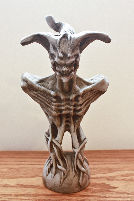 作品理念:想將撲克牌中的人頭牌以異形生物的方式來詮釋來做個系列胸像,Joker 是第一件作品。一般對小丑的印象是總畫著笑臉、帶著小丑帽、拋玩著球,我想將小丑以球中惡魔的方式來表現,並將笑臉和小丑帽合為生物造型的特徵。