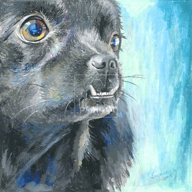 作品理念:一隻暴牙的小黑狗,喜歡吃別人口水,喜歡在馬路上指揮交通,喜歡坐車去兜風,以此紀念在天上奔跑的牠。