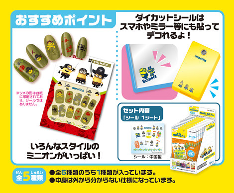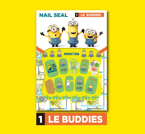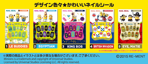 專門推出有趣商品的RE-MENT 玩具公司又將要販售一款令人沒有想過的商品,其將要推出以「黃色小小兵」(minions)為主題的女生「指甲貼紙」作品。這次預計將會推出五款不同主題的黃色小小兵指甲貼紙,包括:普通版、埃及版、國王版、英國版、海盜版。而這次所推出的作品都還會再附送一張黃色小小兵的貼紙,讓各位女孩兒玩具人除了可以貼指甲之外,還可以把自己的手機、筆記型電腦、化妝盒等等都造成小小兵主題!