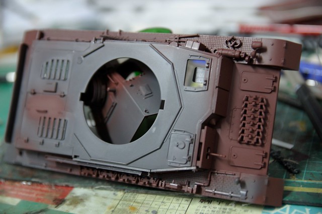 簡易砲塔內購上色,內購先噴上棕色之後,再噴上暗黃色(Dark Yellow),乾了之後再用筆刀輕輕地刮掉一些,露出生鏽的樣子