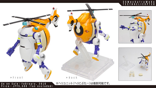 千值練玩具公司量產的35機動機器人WeGo「35Mechatro WeGo」上周才公開預計推出三款新造型和新配色的商品,這次再曝光將推出測試&直升機版本(てすと&へりこぷたー)Test & Helicopter 名稱暫譯,讓35機動機器人WeGo有更多擴充機能的裝備,還多附有一個支撐架讓它表現出漂浮感的模樣,直升機體由早川洋司所擔任原型,喜歡《35機動機器人》的玩具人可以參考一下歐!