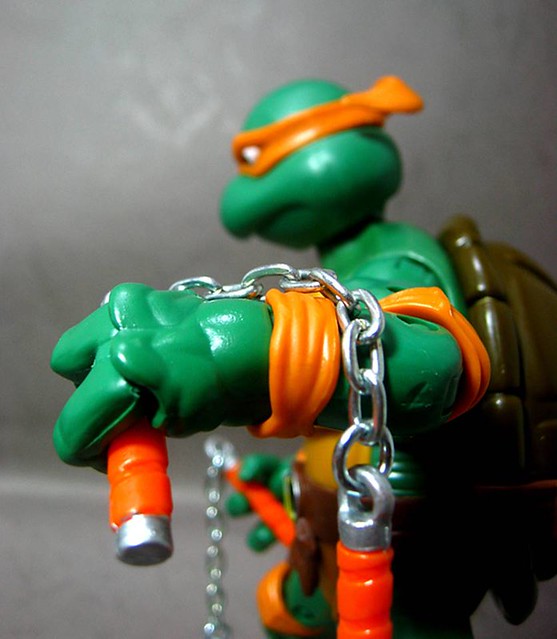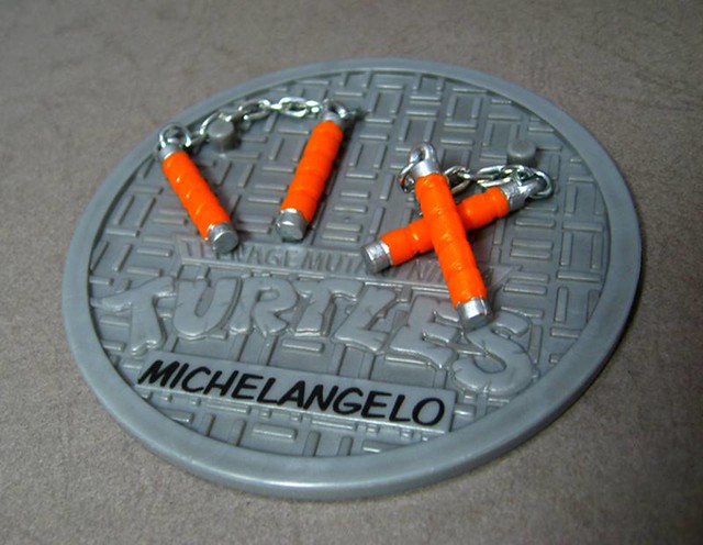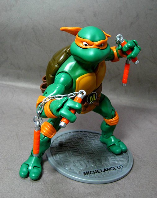 ↓Michelangelo(米開朗基羅/柳丁花),暱稱為Mike,代表色為橙色,武器為雙截棍,生性開朗樂觀,喜歡開玩笑,是隊伍中的開心果