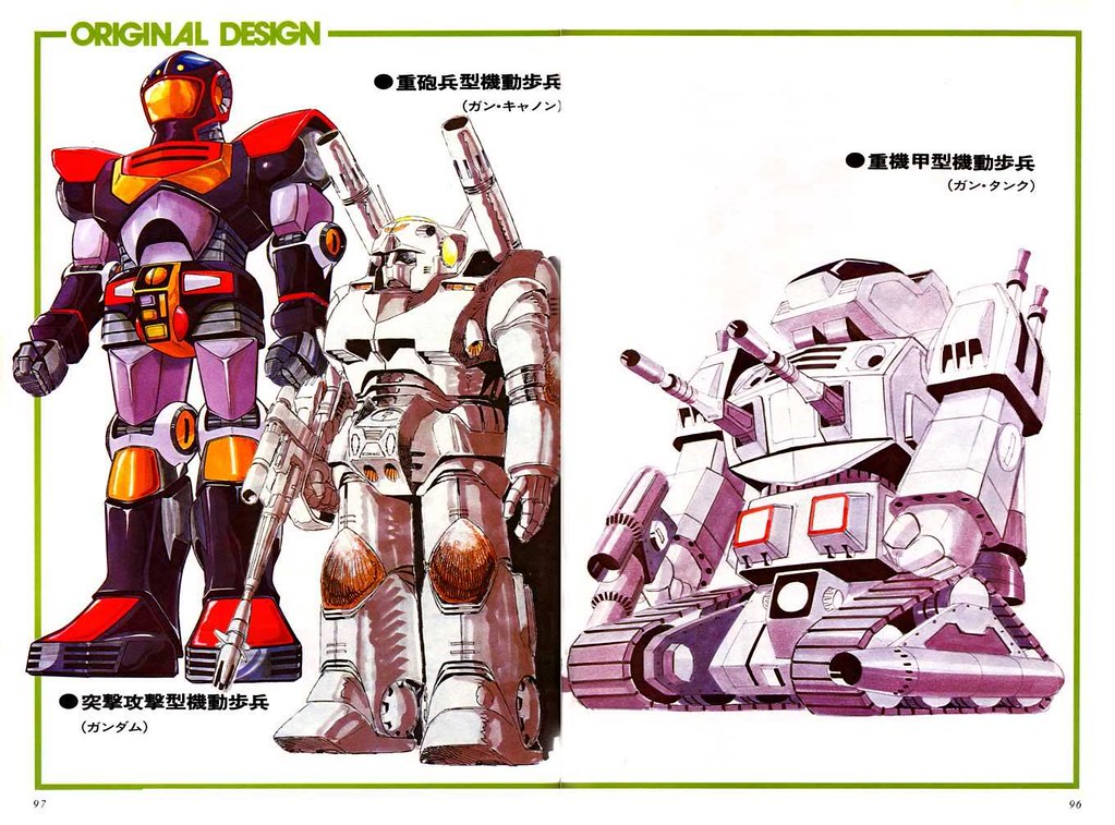 鋼彈主角三人眾的初期設定,從左到右依次是鋼彈、鋼加農、鋼坦克。當時本來要取名為GunBoy,啊不就還好沒有。