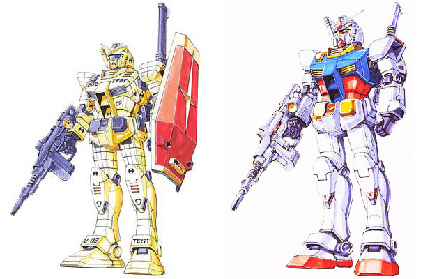 RX-78-2鋼彈初期企畫(左),還保有超級機器人的花俏風格,還好後來決定稿改成了洗鍊簡約的線條(右)。