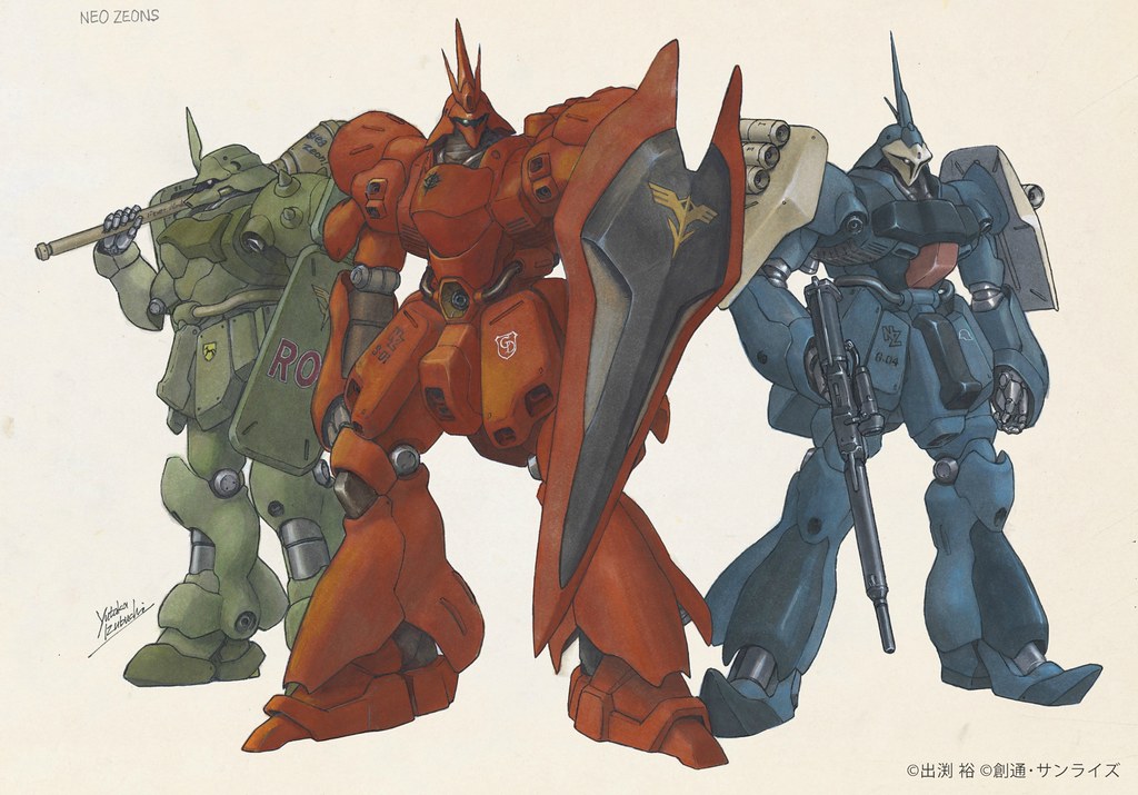 出渕裕算是機械設定界的老前輩,參與了《機動戰士鋼彈 逆襲的夏亞》和《機動戰士鋼彈0080》的機械設計工作,他的線條比較圓潤,帶有一種生物感,他筆下創作出許多像坎普法或沙薩比之後的歷史名機,人氣至今仍居高不下。