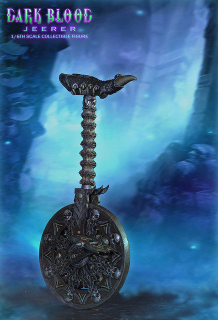 以暗黑風格打造出來的高端1/6 比例收藏級人偶「嘲笑者」作品,在頭雕的部分雕刻的非常細膩,更有附上一款可拆卸式的混沌面具(Chaos mask)。此外,在武器配件的部分則有附上混沌之錘(Chaos hammer)。而在地台的部分更是豪華啊!除了雕刻細緻之外,內有建置LED 發光裝置,發出微微的紫色光芒,實在是太暗黑了啦!
