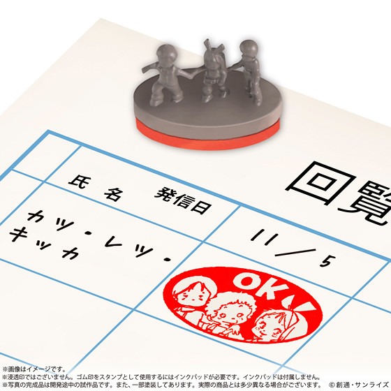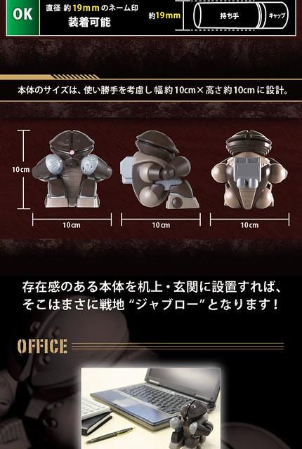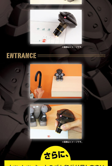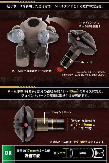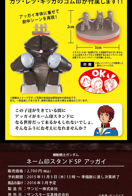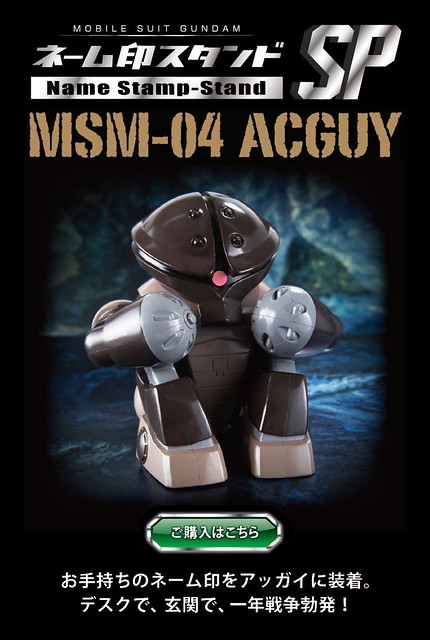 在動畫《機動戰士鋼彈》當中所出現的亞凱“Acguy”機體,於《哀·戰士》劇場版當中獨特的蹲坐姿態讓人印象深刻,此次還將以這個姿態立體商品化結合有實用功能的「印章收納」,推出的亞凱印章組合 ネーム印スタンドSP アッガイ(名稱暫譯),之前也推出過有趣的《機動戰士鋼彈》可動原子筆,將動畫當中的角色人物巧妙的結合文具推出創意商品。