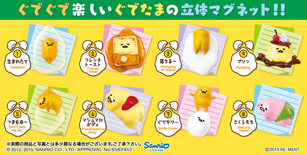 這次所推出的8 款「蛋黃哥立體造型磁鐵」作品主要是結合可口的餐點所推出的磁體作品,加上蛋黃哥本身療癒的風格,實在是把這些平常會吃的餐點詮釋得非常的美味啊!其中包括了:生まれたて、フレンチトースト、落ちる~、プリン、つまむな~、マシュマロボディ、ぐでタワー、さくらもち等。每一款實在是太可愛了拉!相信之後一定還會有第二彈、第三彈的作品啊!!握拳~~