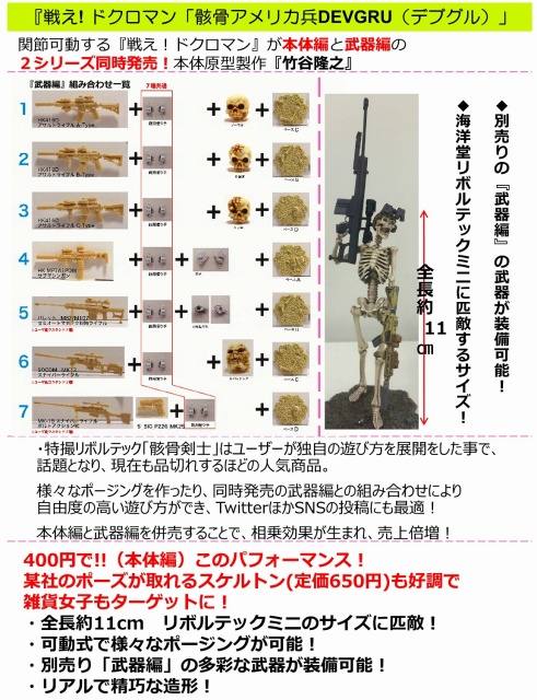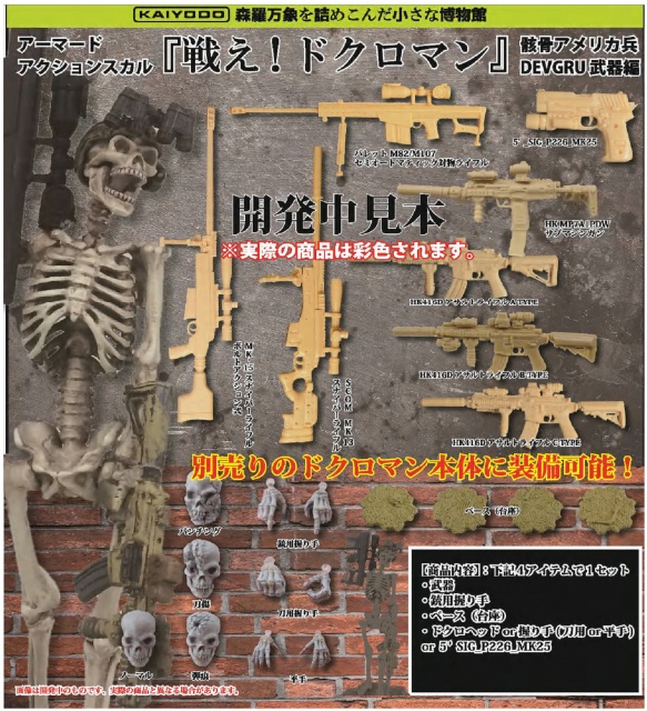 2016年3月21日新增官方清晰宣傳照片和販售資訊,近日海洋堂官網也正式公開其宣傳圖片,以美國海軍特種部隊“海豹突擊隊” 所衍生的反恐特種部隊「DEVGRU(デブグル)」為設計,骸骨士兵的原型是由竹谷隆之老師(オリジナル製作)所執行,再交由大津敦哉老師加工可動關節的部分,而在美軍裝備的部分是岡正信所負責,公開的照片看來地臺和所附的軍武、骨骼等等以轉蛋價位來看感覺都還不錯,對有骸骨戰士有興趣的玩具人可以參考一下歐!