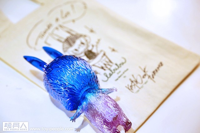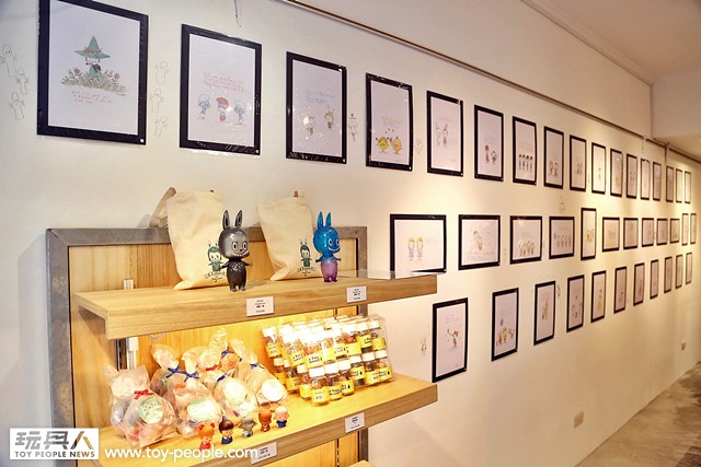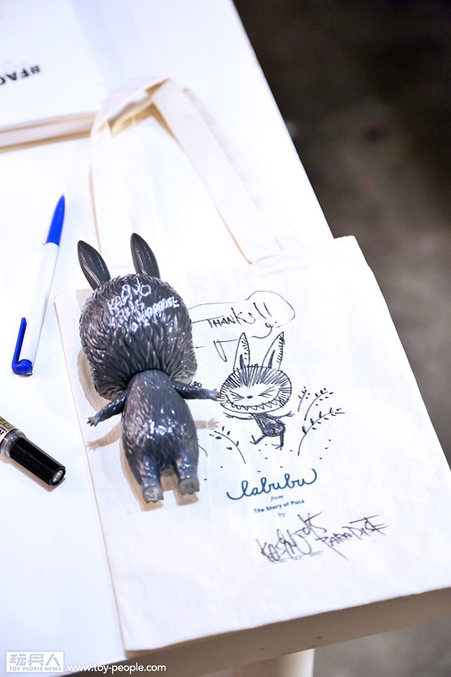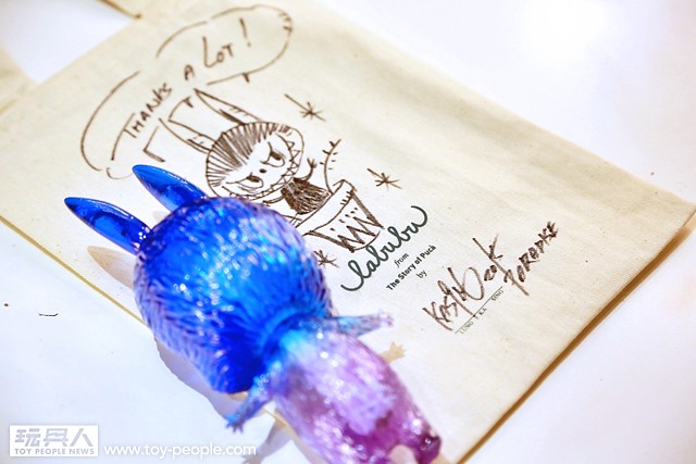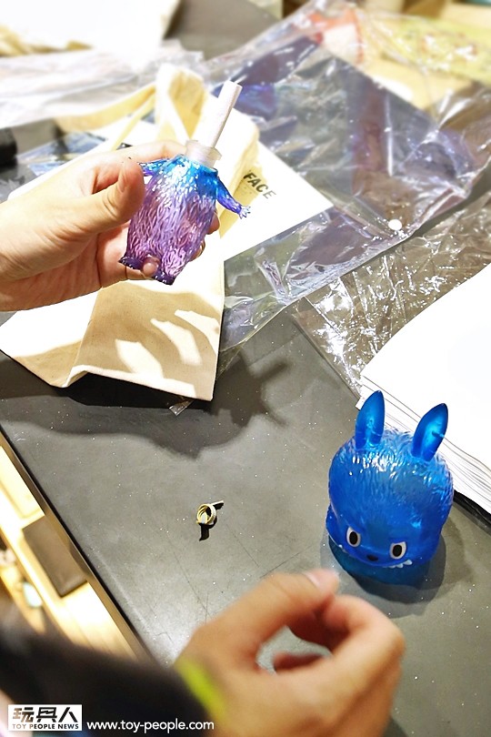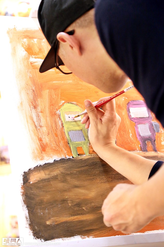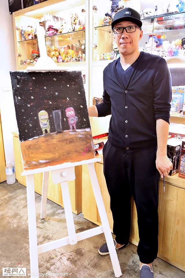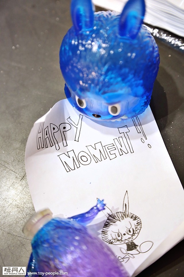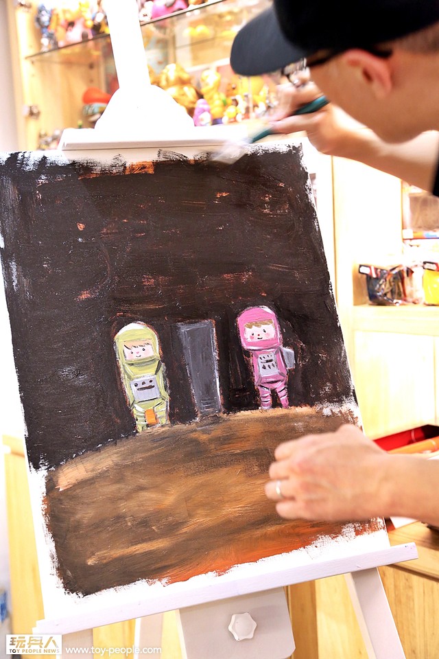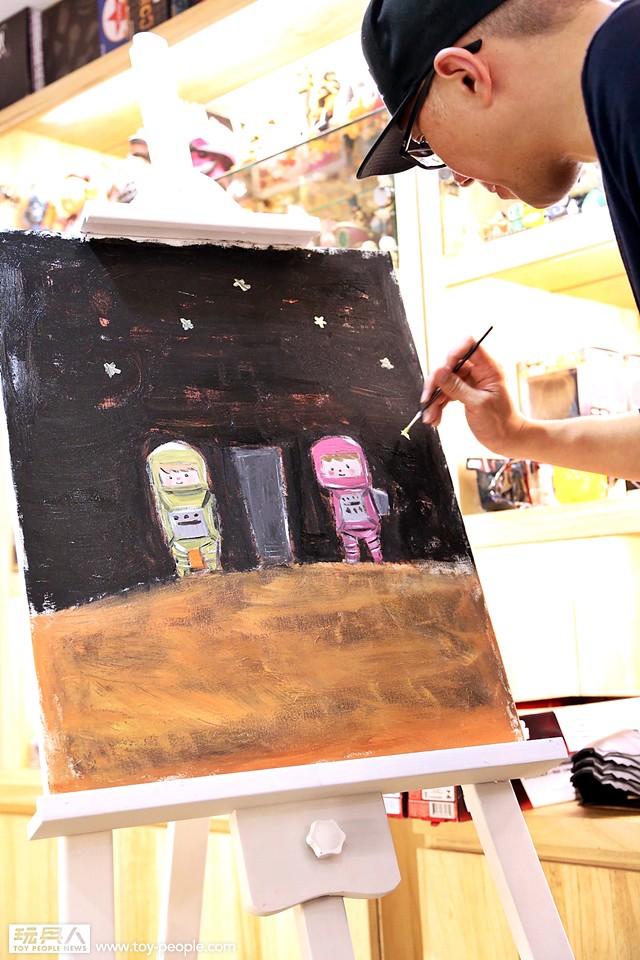 除此之外,這次在展出期間,也推出最新立體作品「Labubu」全彩版本以及限定版本的作品販售,當天熱情的粉絲們竟在30分鐘內就讓限定版本的Labubu“搜奧”下架啦!不知幸運收藏到的玩具人有沒有發現限定版本的Labubu裡有一個小驚喜,是家昇老師親繪的小紙條喔!據說每一張都不一樣,真的是一個瓶中信的概念啊!另外在週六的下午,老師甚至在個展現場舉辦了Live Painting!短短的一小時,家昇老師像是魔術師般的在畫布上用壓克力顏料繪製了這次個展海報的主視覺「2100 太空漫游」,在老師作畫的過程中,小編在現場感受到大家都屏氣凝神、專注的欣賞老師作畫呢!