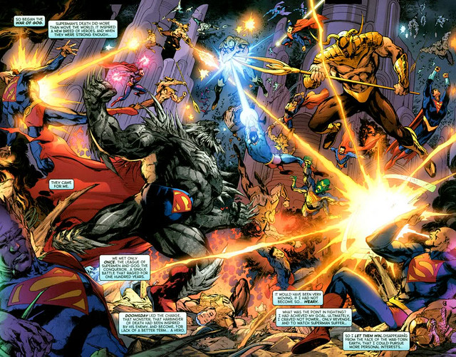 但毀滅日的細胞早就適應死亡,所以並沒有真正的死去,結果葬禮船降落在地球地底下,毀滅日一甦醒馬上開始進行屠殺,任何動物、植物,只要有生命的,都逃過魔掌,因為毀滅日就是一個生命的敵人。正義聯盟知道後,全員都趕來阻止,但都無可奈何,Booster Gold(金色先鋒)說他是一個會活動的末日,因此稱這生物為Doomsday(毀滅日),最後超人跟毀滅日力戰,兩方都真的死亡了。