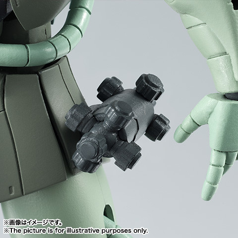 作品附有交換用手首左右各4種、脚部3連裝導彈莢(ミサイル・ポッド) 左右都有、導彈(ミサイル)×6、ミサイルエフェクト×2、クラッカー×2、クラッカーホルダー、艙口蓋開閉開關(ハッチ開閉スイッチ)、マゼラ・トップ砲、薩克 機槍(ザク・マシンガン)、薩克 火箭筒(ザク・バズーカ)、 電熱斧頭(ヒート・ホーク)、電熱斧頭 收納型態 ヒート・ホーク(収納形態)、手首收納配件、隊長機用的頭部配件,多收集幾台還可以組成薩克軍隊,喜歡《機動戰士鋼彈》系列的玩具人千萬別錯過了歐!