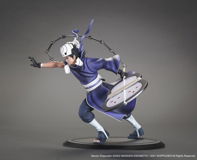 TSUME Art 品牌繼日前推出了施展絕技雷切的「旗木卡卡西」1/10 比例的雕像作品之後,又將要推出這個經典的角色。而這次所推出的「宇智波帶土」造型為其手持著有兩對六勾玉圖樣的「軍配團扇」,此扇的把柄連著鎖鏈。此外,在漫畫中宇智波帶土的面具在大戰中被卡卡西轉移入時空間的鳴人用螺旋丸擊破,這款雕像作品也將面具破裂的造型完整呈現。