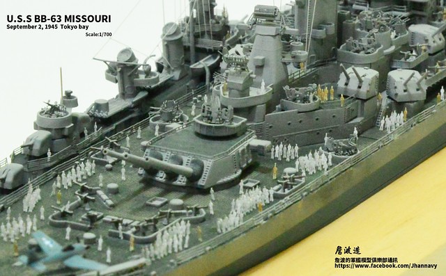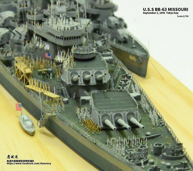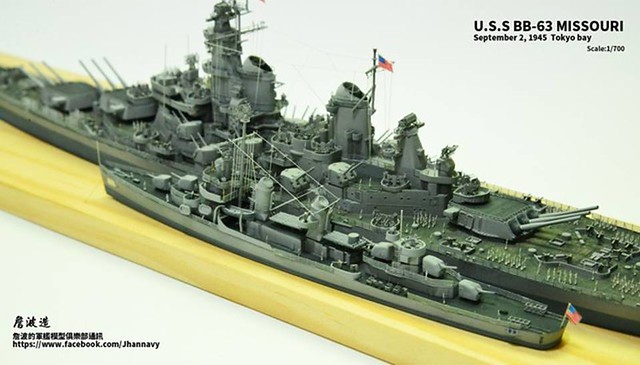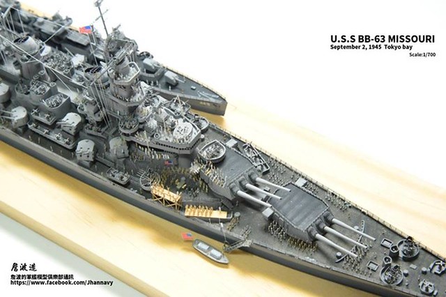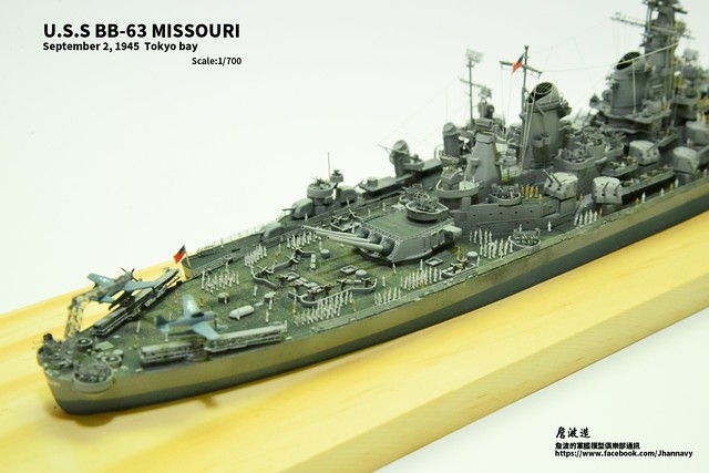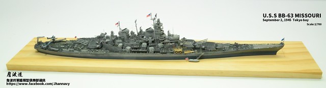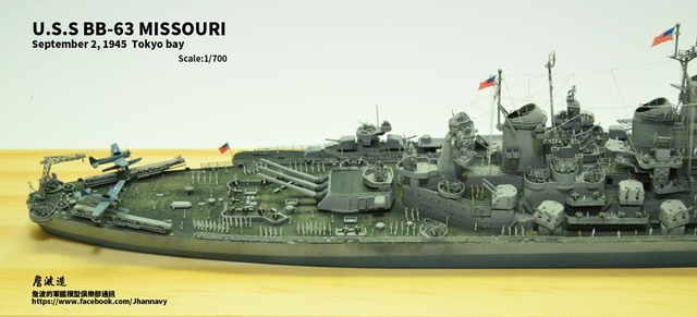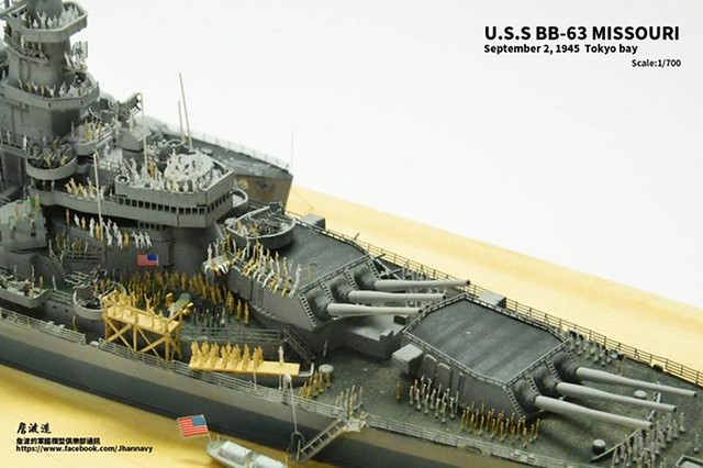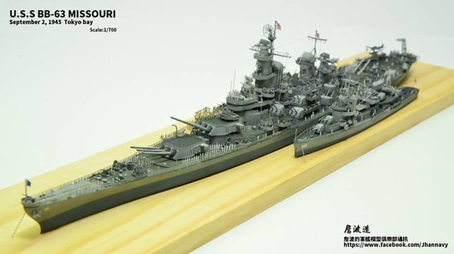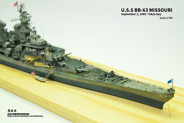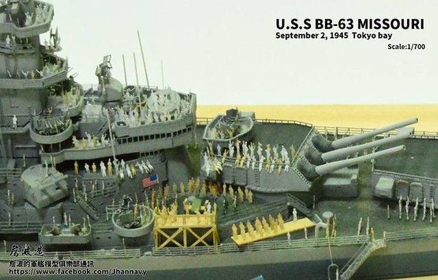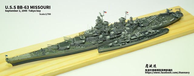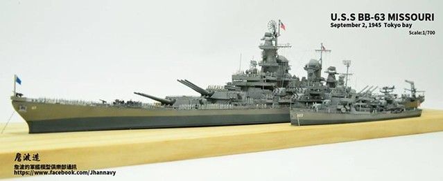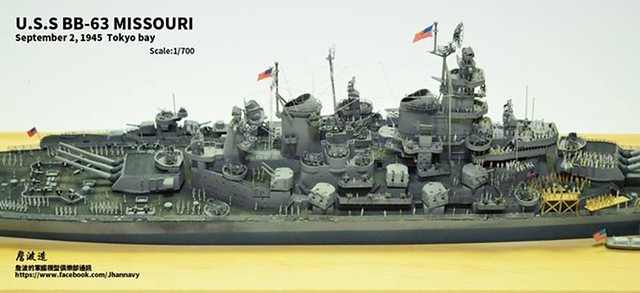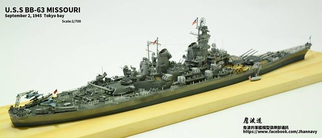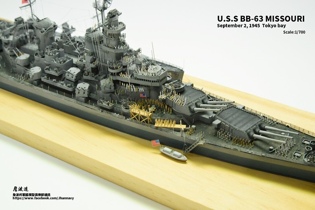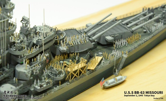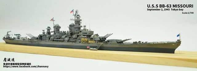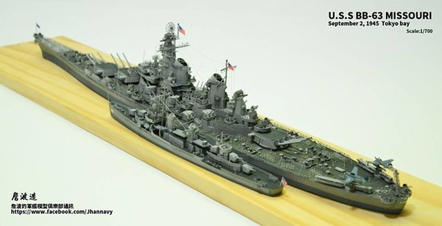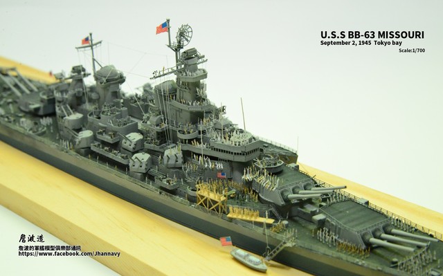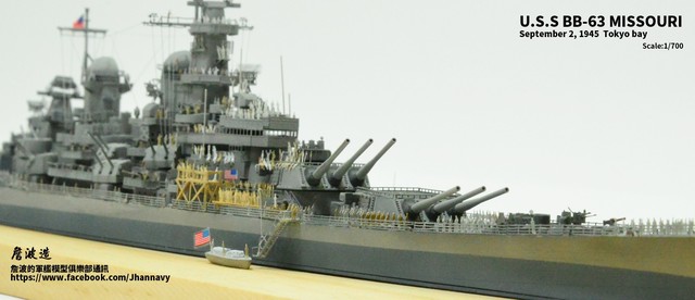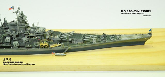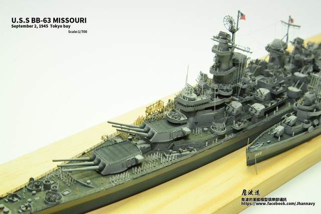 各位好,我是詹波,興趣是軍艦模型,今天分享的是美國海軍戰艦bb-63 Missouri。本艦是美國海軍最經典的一艘戰艦,也是標誌著大艦巨砲主義的巔峰,最為人津津樂道的是密蘇里號於1945年9月2日作為受降儀式的舉行場所,整個二次大戰也就在這艘艦上隨著儀式結束,本次製作的即是1945年受降儀式的樣貌,現在就讓我們一起來看看製作的過程吧!