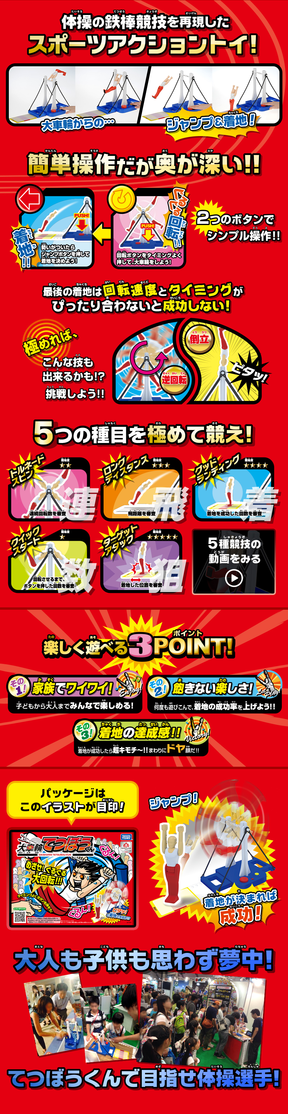 這一款玩具是由日本知名的廠牌「TAKARA TOMY」所推出,名字叫做「大車輪!鐵棒君」(大車輪てつぼうくん)。遊玩時,需要掌握極佳的操縱節奏,才能夠控制玩偶巧妙地在鐵棒上旋轉、並加速,最後還要抓準時機按下按鈕,讓人偶在激烈的迴轉之後完美地落地。 雖然看起來簡單,但實際上意外地困難,如果節奏抓不準,就連想要讓人偶在鐵棒上迴轉都很困難。