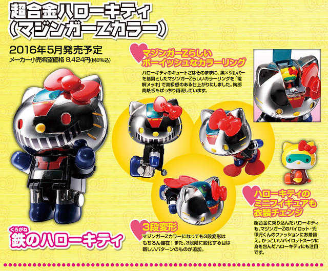 「超合金 凱蒂貓 無敵鐵金剛配色」,是以2014 年的雙重40週年紀念商品「超合金 Hello Kitty」為基礎,由粉絲投票選出最高人氣的配色所設計而成。全身變更為「無敵鐵金剛」配色將以特殊的電鍍技巧來製作,就連駕駛員「凱蒂貓」也變更為兜甲兒配色! 除此之外,原本商品所設計的3段變形功能依舊健在~ 而3段變化時的眼睛變化效果也隨之更改為新造型。
