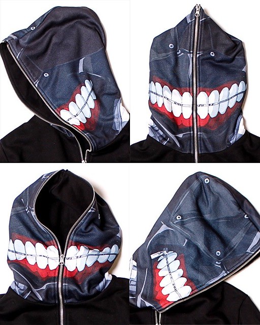 這一系列由DOWBL 所推出的服飾與周邊中,最受到矚目的就是以“金木研”面具造型為概念的連帽外套,利用特殊的印刷技術,將金木研面具造型的圖樣印製在帽子上,拉上拉鍊之後就能夠讓穿戴者重現金木研的經典造型。除此之外,還將推出金木研圖樣的T恤、咖啡主題T恤以及咖啡杯...等周邊。 精彩帥氣的造型連帽外套真是太帥氣! 各位喜愛《東京喰種》的粉絲是不是該入手一件來穿呀?!