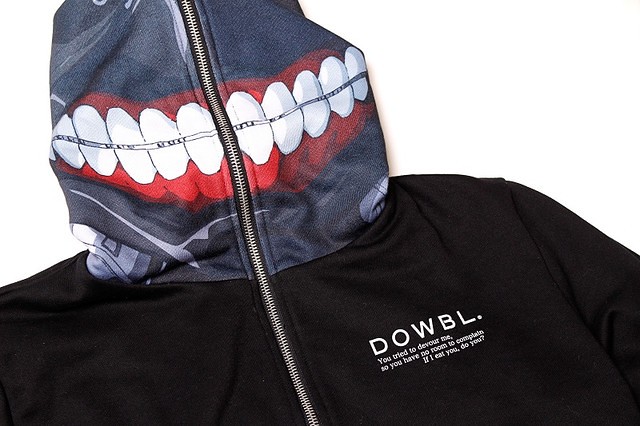 日本潮流品牌DOWBL,將推出熱門動畫《東京喰種》主角“金木研”面具造型的連帽外套,以及多樣服飾與周邊商品。