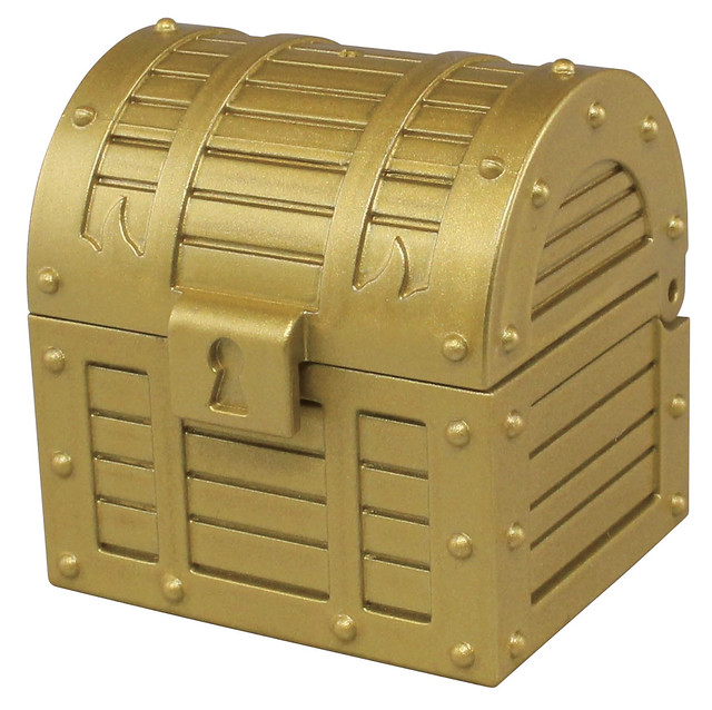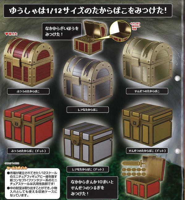 「傳說的寶箱」,是以電玩中經常出現的“寶箱”為設計的轉蛋玩具,採用1/12 比例製作,能夠搭配各式各樣的可動玩偶,當作有趣的小道具使用。 打開寶箱的內容,將設計成堆成小山狀的金塊、金幣,也可將內容物取出,自行變換活用。 另外,寶箱中的內容物除了財寶之外,也會出現附有點陣相素風格的“傳說之劍”與錢幣,讓可玩性、樂趣大幅提昇!~