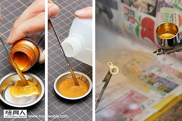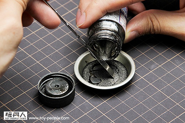 ▼ 首先要主色用的GAIA020槍鐵色用調色棒倒出,方便稀釋使用。