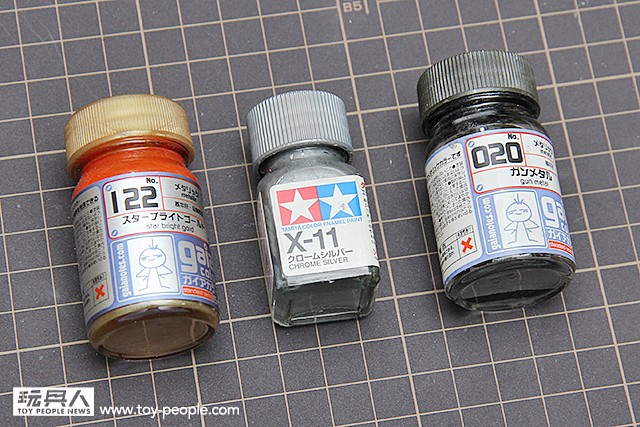 ▼ 這三瓶就是我們今天要為骨架上色的佐料嘍~從左至右分別為GAIA122星燦金、田宮X-11鉻銀色、GAIA020 槍鐵色。