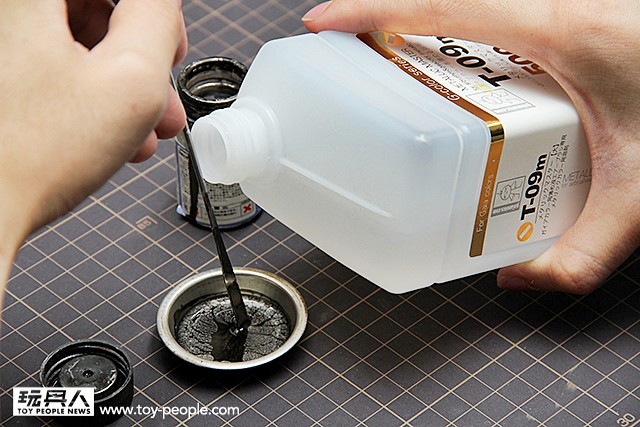 ▼ 接下來要使用T-09金屬漆專用溶劑,幫助金屬粒子可以均勻的散佈。