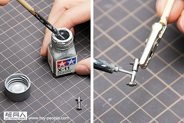 ▼ 使用面相筆沾取少許的X-11漆料,將油壓管分色。