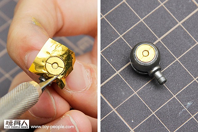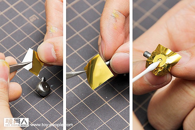 ▼ 將金箔用鑷子小心的撕下,貼上零件表面並用棉花棒壓出形狀,需要稍微用力去壓出造型。