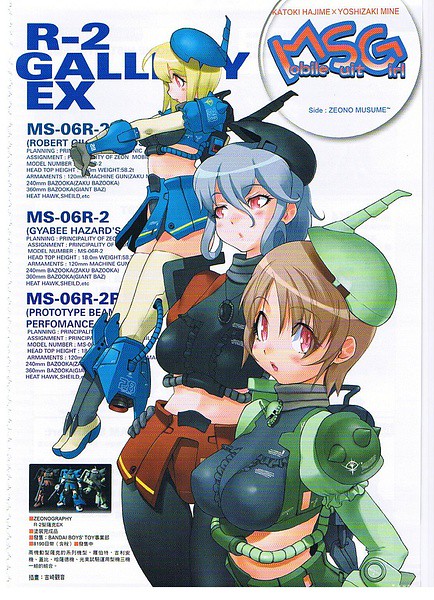 除了明貴美加之外,動漫業界還有許多MS少女的愛好者。比方說像是《KERORO軍曹》的作者吉崎觀音,就曾經和機械設計師Katoki聯名在雜誌上連載MSG單元。另外,像是插畫家與角色設計師駒都英二,也是畫鋼彈機娘出了名的。