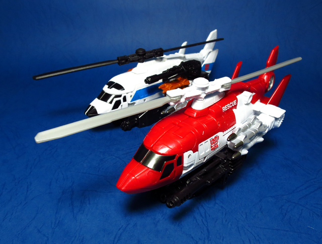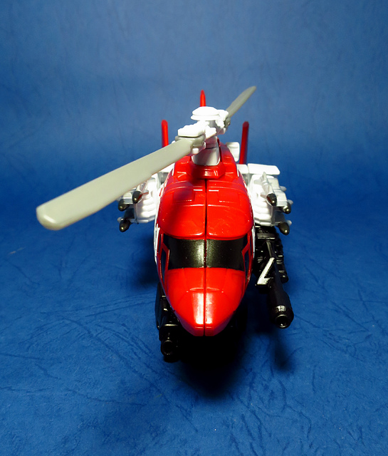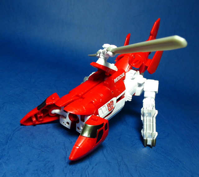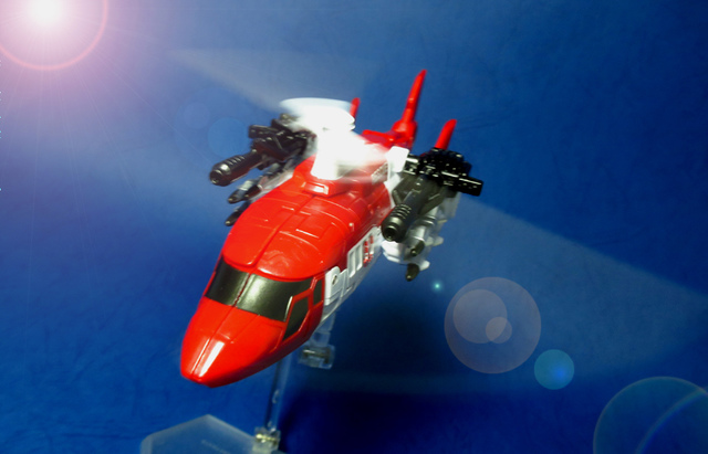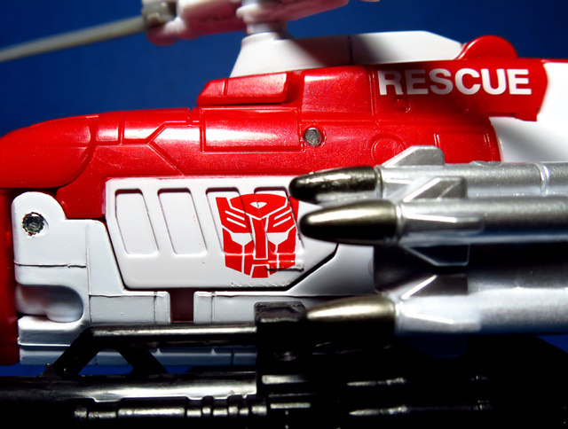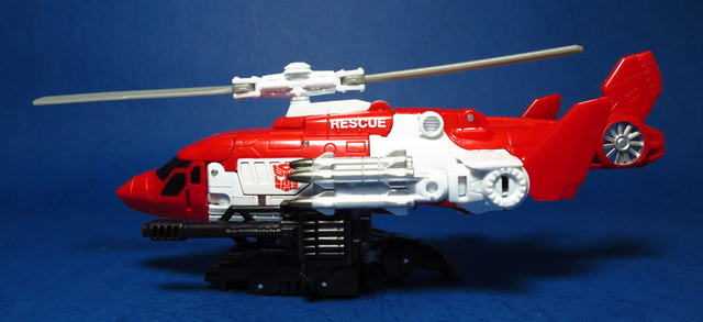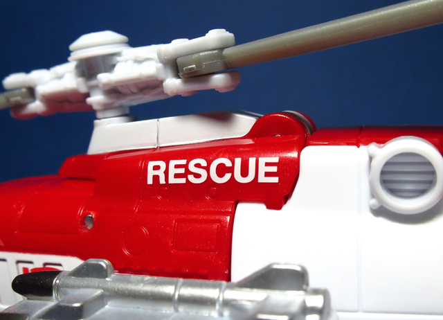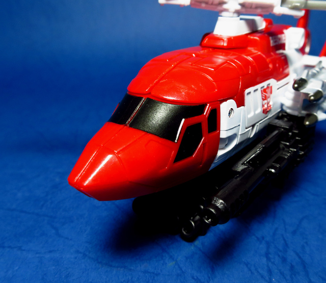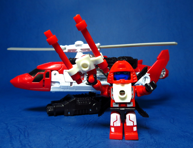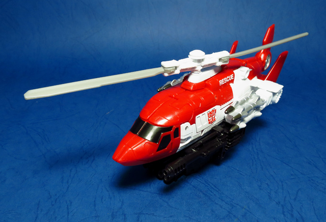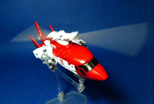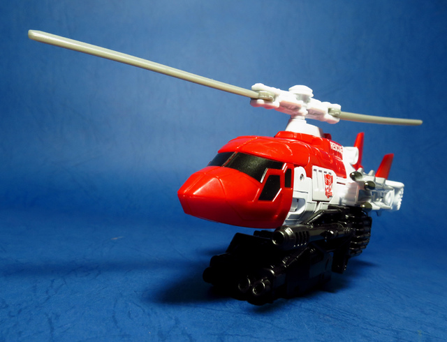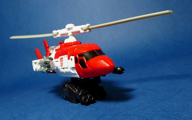 關於這個直升機模組,早在CW第一波的Alpha Bravo(凌雲/鋏翼)時,許多玩家們就已經推測到官方進一步的重塗策略,果不其然,不論是軍事合體中的Vortex(旋風/維迪斯),抑或是本篇要分享的刀刃,均是出自於這個設計,並不是說這個模組不好,但若要針對角色細節作出評論,我認為這款刀刃其實還有一些改模的空間。在設定上,刀刃比較偏向一台「救援」直升機而非戰鬥用途,因此在元祖的G1老變中,他的造型其實並沒有搭載任何武裝,但是CW卻直接延用了這個模具,導致他的雙臂居然裝滿了導彈,說真的,載具模式下雖然有著顯眼的「RESCUE」標語,但兩側卻掛滿了飛彈,看起來真的...頗是諷刺,若能將手臂改模為起落架,相信會更還原這位成員應有的樣貌。玩具本身和Alpha Bravo並未有太大的差異,不論是載具或是機器人均有著中規中矩的表現,至於亮點,大概就是有著一張略為慘淡的藍臉,然而,面部表情和嘴部的刻劃個人卻是十分地讚賞,相形之下一些第三方的嘴部還是只有一條平淡無奇的刻線,官方這回的表現,在我心中可說是大大的加了分。那麼,接下來就讓我們看看這台直升機的表現吧!