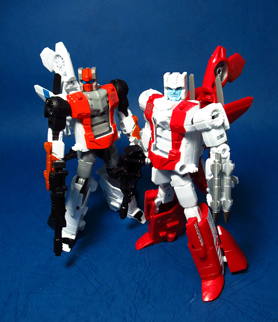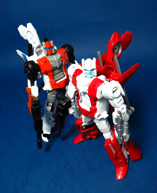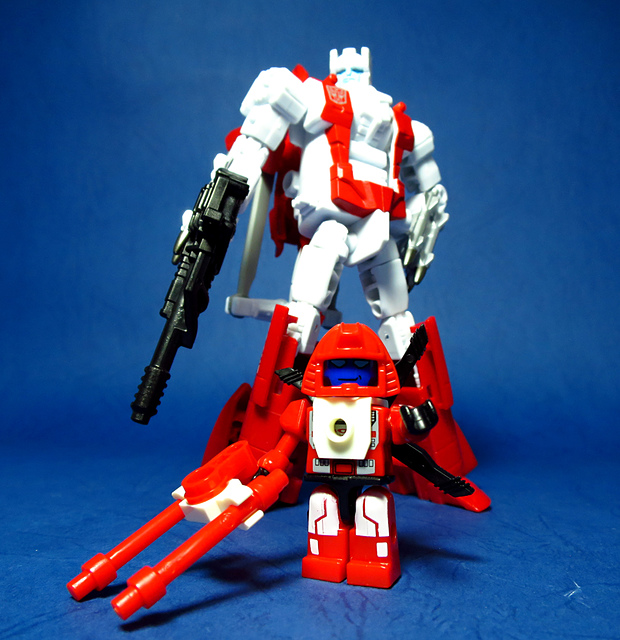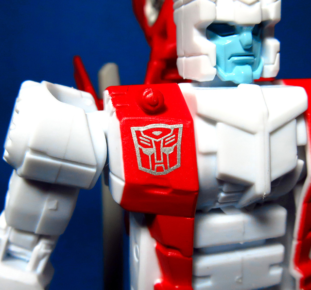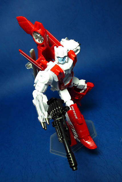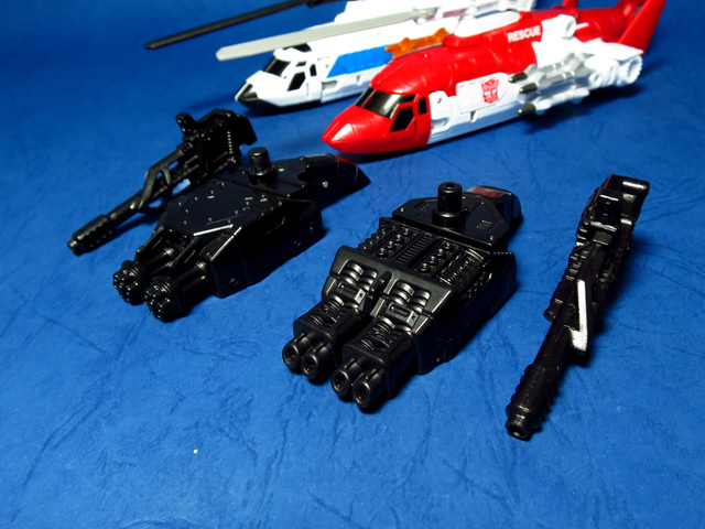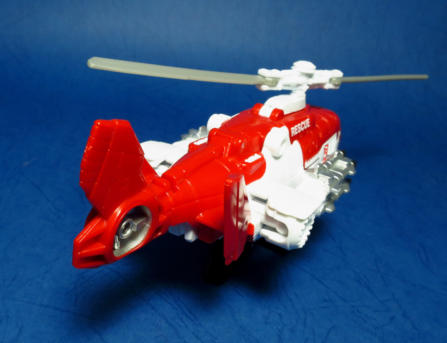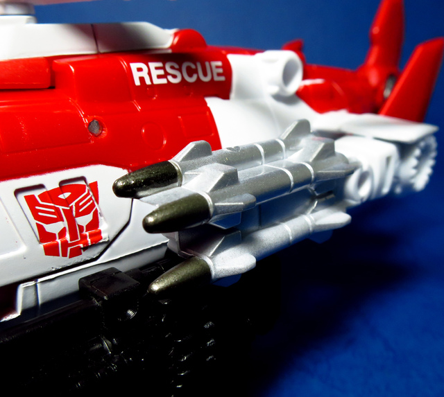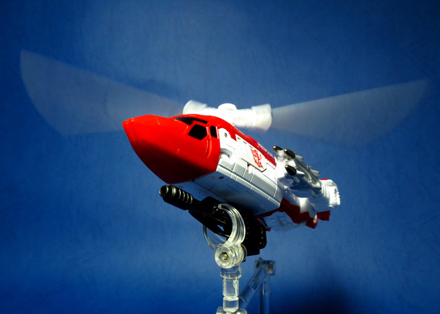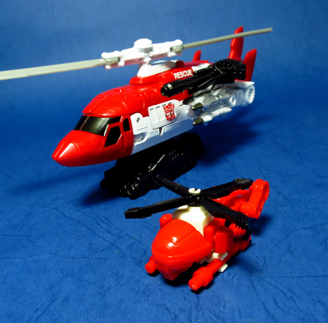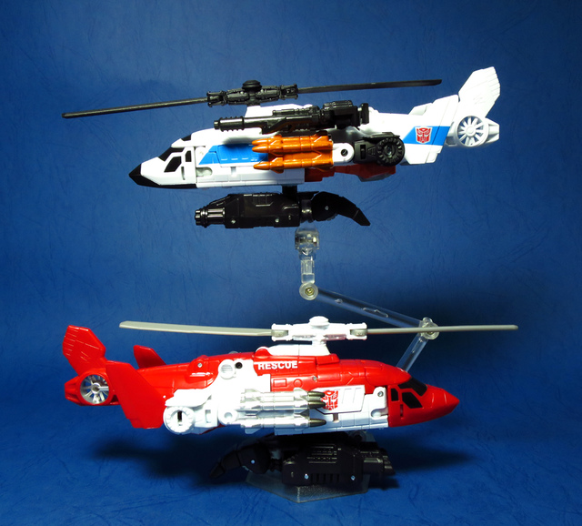 關於這個直升機模組,早在CW第一波的Alpha Bravo(凌雲/鋏翼)時,許多玩家們就已經推測到官方進一步的重塗策略,果不其然,不論是軍事合體中的Vortex(旋風/維迪斯),抑或是本篇要分享的刀刃,均是出自於這個設計,並不是說這個模組不好,但若要針對角色細節作出評論,我認為這款刀刃其實還有一些改模的空間。在設定上,刀刃比較偏向一台「救援」直升機而非戰鬥用途,因此在元祖的G1老變中,他的造型其實並沒有搭載任何武裝,但是CW卻直接延用了這個模具,導致他的雙臂居然裝滿了導彈,說真的,載具模式下雖然有著顯眼的「RESCUE」標語,但兩側卻掛滿了飛彈,看起來真的...頗是諷刺,若能將手臂改模為起落架,相信會更還原這位成員應有的樣貌。玩具本身和Alpha Bravo並未有太大的差異,不論是載具或是機器人均有著中規中矩的表現,至於亮點,大概就是有著一張略為慘淡的藍臉,然而,面部表情和嘴部的刻劃個人卻是十分地讚賞,相形之下一些第三方的嘴部還是只有一條平淡無奇的刻線,官方這回的表現,在我心中可說是大大的加了分。那麼,接下來就讓我們看看這台直升機的表現吧!