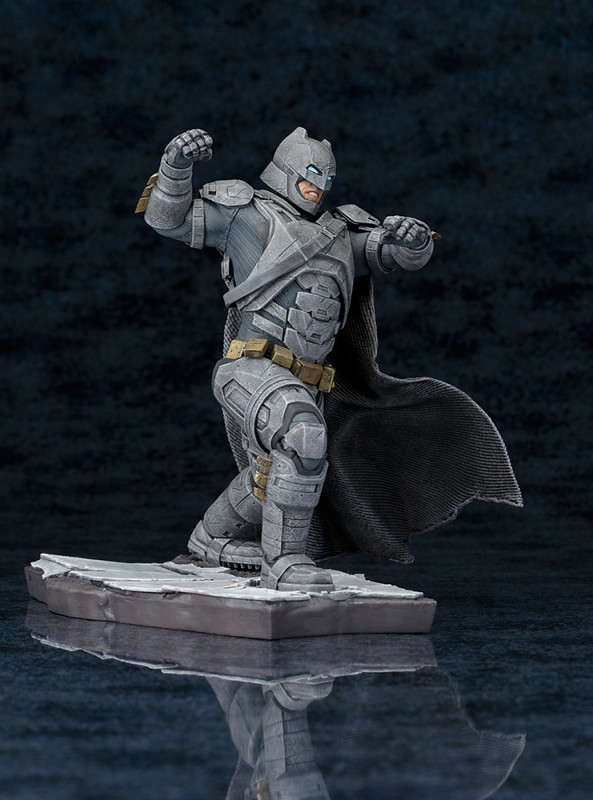 這次所發行的《蝙蝠俠對超人:正義曙光》蝙蝠俠雕像,是採用劇中蝙蝠俠首度登場、對抗超人專用所開發的重型裝甲造型;有別於凌空飛起的超人,重裝蝙蝠俠呈現了壓低的姿態、因腳部抵住而變形扭曲的柏油路,更加地強化其重量感與強大力量;即使是只有露出嘴部,也能感受到蝙蝠俠因即將奮力揮出一記重拳的奮力神情。