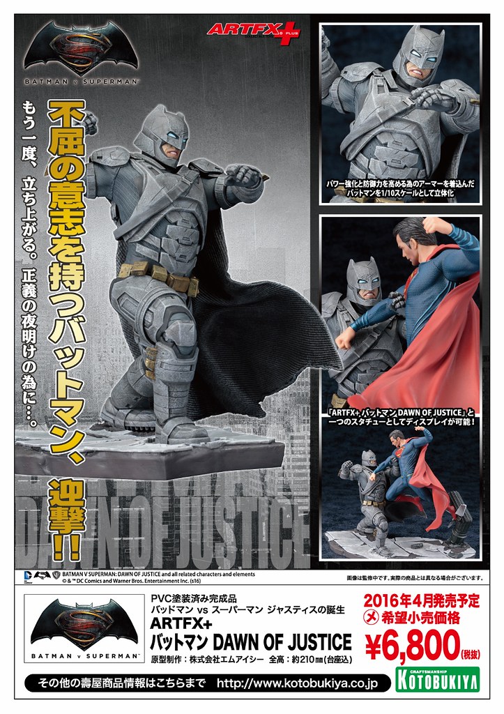日本造型廠牌「壽屋」的高端收藏級靜態作品系列「ARTFX+」,宣布將推出DC 最新超級英雄電影《蝙蝠俠對超人:正義曙光》的超人 & 蝙蝠俠對決場景雕像,兩個款式能夠合併為一個極具張力的震撼場景,預計2016年4月發行,售價每款¥6,800。